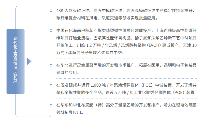 中国石化锚定“世界级、高科技、一体化”目标,积极引领“油转化”“油转特”进程,持续加强高端树脂、高端橡胶、高性能纤维、特种精细化学品等研发生产,积极推动聚乙醇酸(PGA)、PBAT等可降解材料业务发展,成功产出超高分子量聚乙烯纤维、对位芳纶纤维、48K大丝束碳纤维等产品,向社会提供大量特色化工材料和高端专用化学品,显著增强现代化工产业链供应链韧性和竞争力。