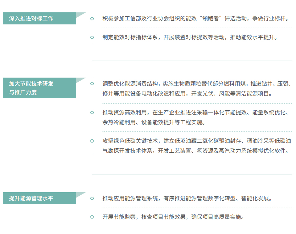 中国石化连续9年开展“能效提升”计划,持续优化能源管理制度体系,研发应用绿色环保的新工艺、新技术、新产品,通过管理节能、技术节能、项目节能、新能源利用、信息化建设等方式,推动能源资源节约集约高效利用。2023年,公司实施“能效提升”项目497项,节能86万吨标煤,节能率2.2%。