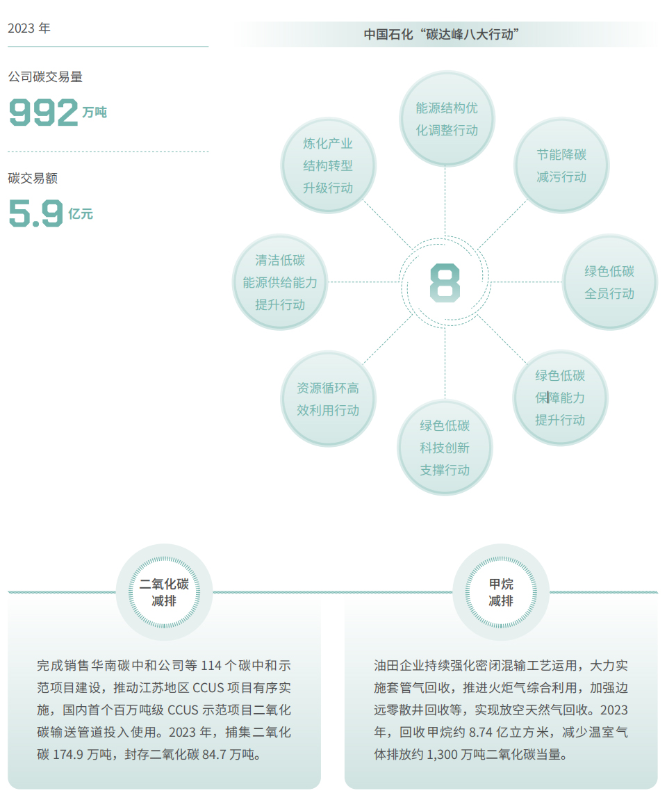 中国石化全力推动实施《中国石化2030年前碳达峰行动方案》,开展“碳达峰八大行动”,持续推进二氧化碳、甲烷等温室气体减排。开展碳数据质量提升专项行动,顺利完成年度碳盘查和碳核查任务,编制企业温室气体排放报告。印发《中国石化碳交易管理办法》,积极参与试点和全国碳交易,指导企业开展内部交易,按时完成配额履约工作。