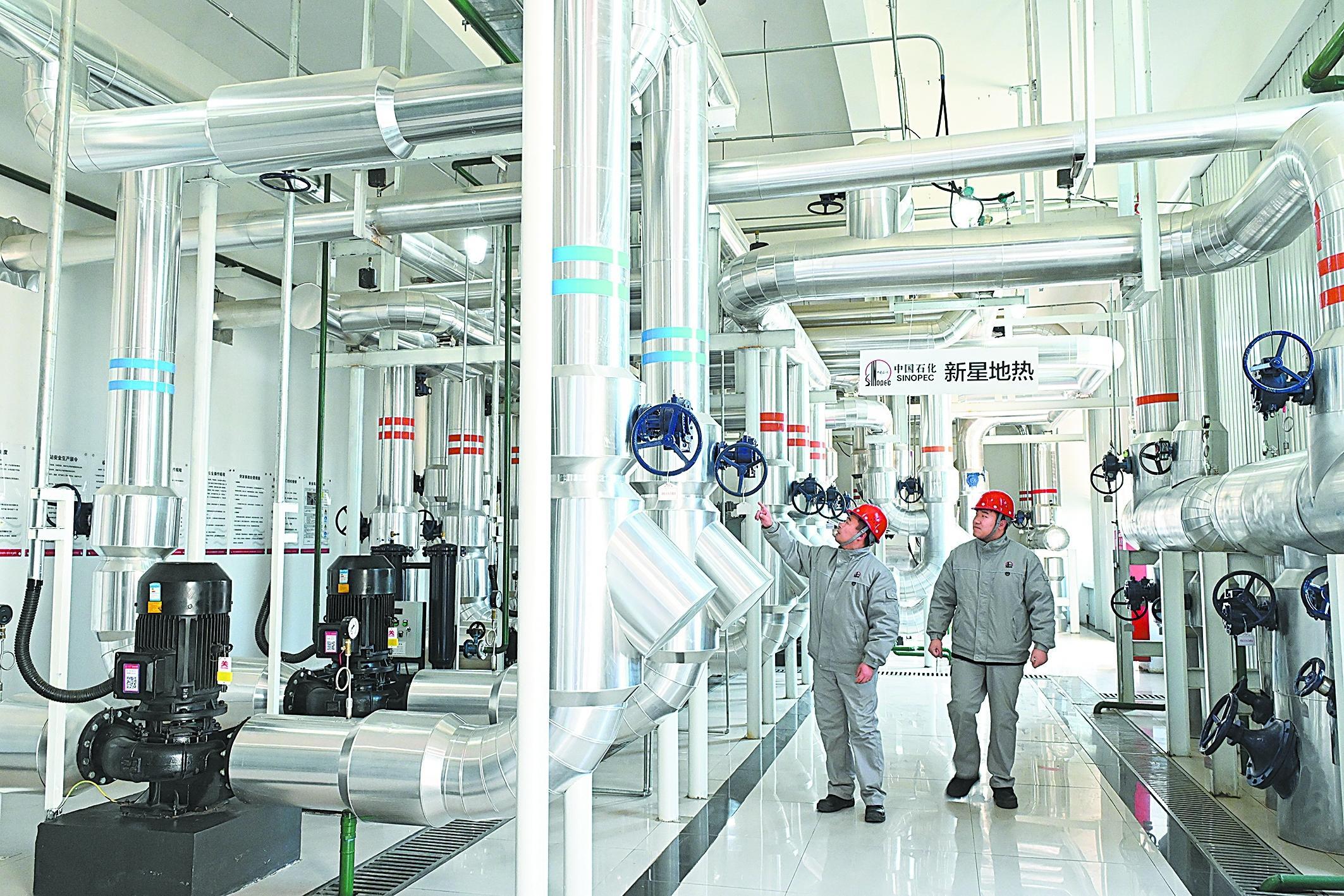 新星绿源公司采用新能源智慧化生产运维管理平台、供热运行指导软件系统等数智化手段,实现每日供暖策略智能生成、供暖温度智能调节,有效降低能耗,提升供暖质量。本轮供暖季,该公司在雄安新区运营地热供暖能力同比明显增长。图为2月22日该公司员工对雄安科创中心中试基地地热运行装置进行巡检。本报记者 胡庆明 摄 肖 红 程泉洲 文