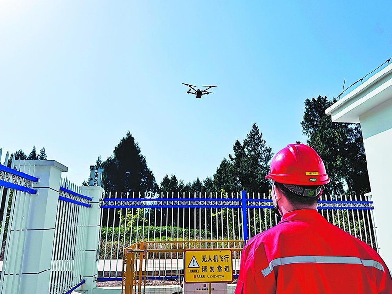 西南油气分公司采气二厂近期完成元坝气田首批无人机机场建设并顺利实现首飞,形成“无人机+AI异常智能识别+远程喊话+光纤预警系统+地灾监测预警系统”的巡护管理模式。图为4月8日元坝27-1井员工使用无人机巡检。邹振敏 摄 张园园 文