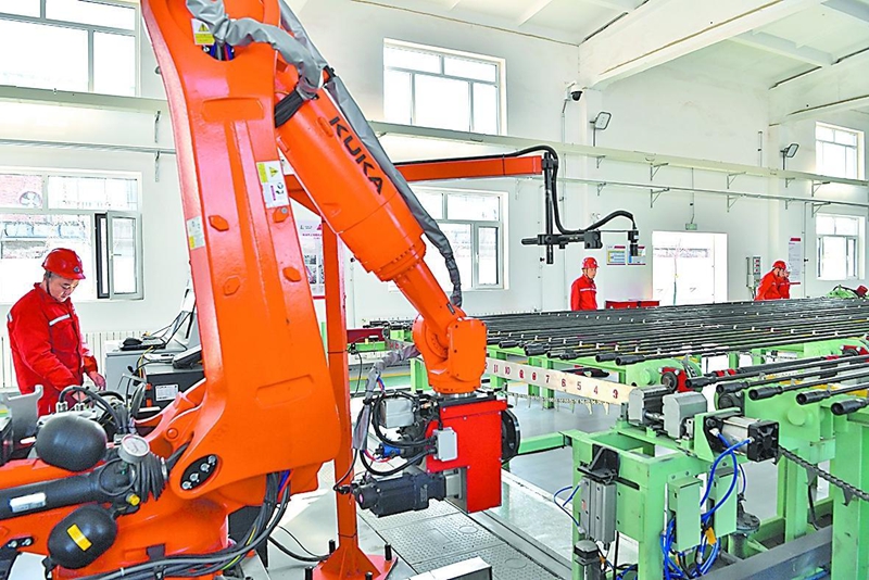 中原油田油管杆自动化修复基地新引进抽油杆上接箍机器人,可实现抽油杆自动选择、螺纹精准柔和对接,自动完成抽油杆接箍上卸扣等工作。图为近日该机器人在进行作业。 陈 涛 摄 孙 博 文