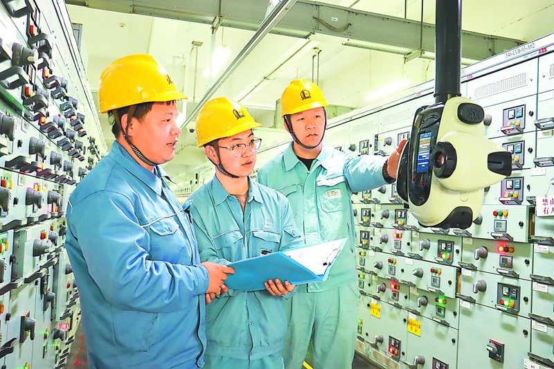石家庄炼化电气仪表中心S12变电所今年初上线智能机器人,实现24小时不间断巡检,可实时在线监测电气设备运行状态,提升运行可靠性。图为4月8日员工检查智能机器人运行状态。程华龙 摄 支玉铭 文