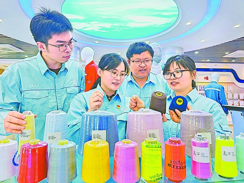 仪征化纤加强产研销合作,大力开拓绿色产品市场,1月至4月,1.3D再生缝纫线纤维、再生涤纶短纤维等再生系列绿色产品产量同比增长186%、销量增长159.5%。图为5月8日工作人员查看1.3D再生缝纫线纤维产品。刘玉福 摄