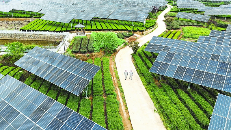 近日,新星公司安徽岳西茶光互补项目现场,茶农迎来丰收季。该项目是中国石化首个乡村振兴茶光互补项目,在800亩茶园架设光伏板,建设集中式光伏发电站,装机容量19.8兆瓦,探索生态效益与经济效益双赢的乡村振兴新业态。图为新星公司员工进行安全巡检。刘东尧 摄 贺宇慧 文