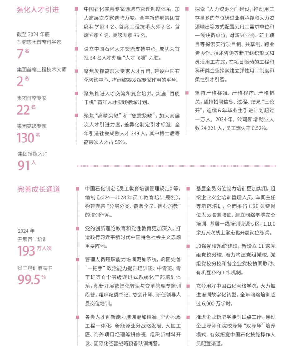 中国石化秉持“人才是第一资源”的理念,大力实施人才强企战略,始终重视维护员工的各项合法权益,持续关心关爱员工身心健康,全方位培养引进用好人才,切实加强对员工的人文关怀