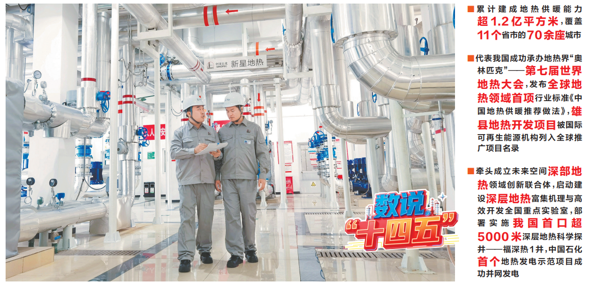 “十四五”以来,中国石化积极引领我国地热产业发展,完善推广“雄县模式”,稳步推进“地热+”业务布局,把地下“绿色空调”送入千家万户。截至目前,累计建成地热供暖能力超1.2亿平方米,覆盖11个省市的70余座城市、惠及120余万户居民,成功打造10座清洁供暖“无烟城”,每年可实现替代标煤约230万吨,减排二氧化碳超590万吨,是国内最大的中深层地热能开发利用企业。