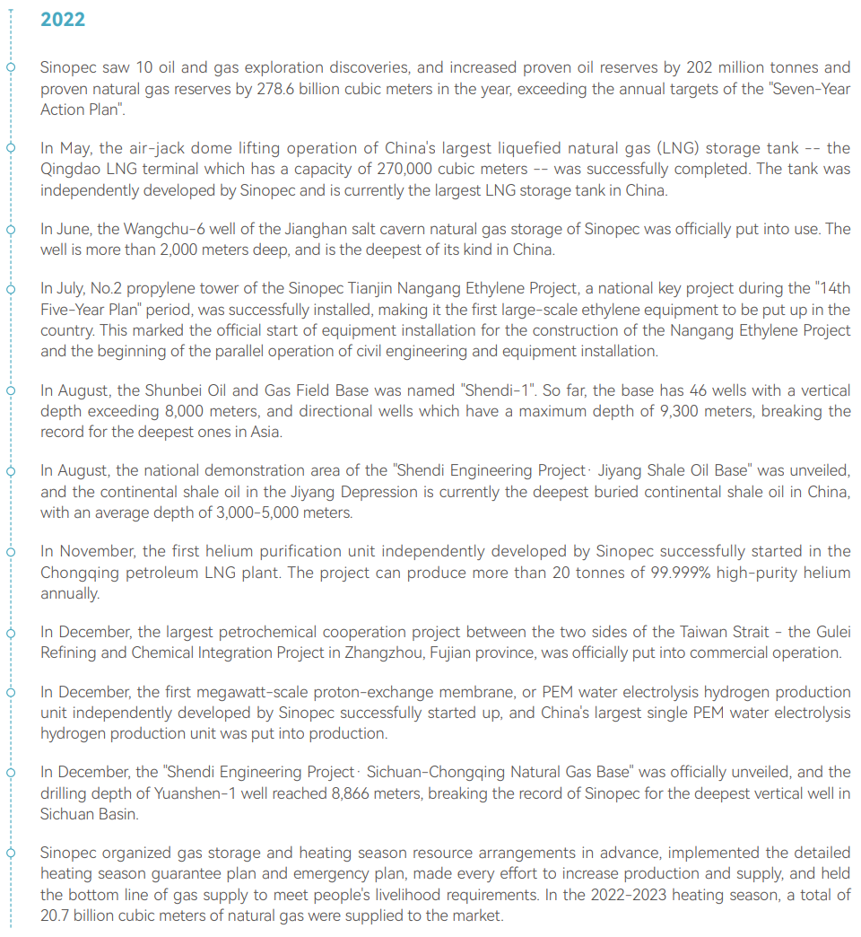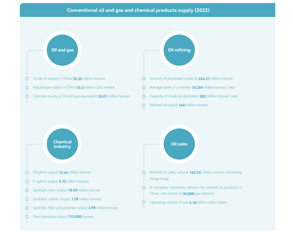 Sinopec shoulders the three core responsibilities of "ensuring national energy security, leading the high-quality development of China's petrochemical industry, and acting as a national strategic sci-tech force", and follows its vision of "building a World-Leading Clean Energy and Chemical Company", accelerates the development of "One Foundation, Two Wings and Three News", where energy resources are the foundation, clean oil products and modern industry as the two wings, and new energy, new materials and new economy as important growth poles. Sinopec is creating a multi-dimensional, coordinated and well-matched integrated industrial system, with a focus on building the petrochemical industry chain covering oil and gas exploration and development, refining and the chemical industry, oil and gas sales, and natural gas utilization. Sinopec has steadily developed petroleum and refining engineering services, international trade and other businesses, comprehensively improved energy supply security capabilities, and is serving people's needs for a better life.