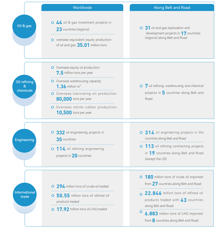To meet China's opening-up at higher levels and speed up the "going global" strategy, Sinopec takes active part in international cooperation on energy and market competition, optimizes global deployment with the focus on the countries along the Belt and Road, and advances overseas oil and gas exploration and development, oil refining and sales, chemicals and new materials, and engineering and technical services in a coordinated manner, in an effort to support the sustainable development of global economy and society. In 2022, Sinopec operated in 66 countries and regions overseas, with 286 projects underway.